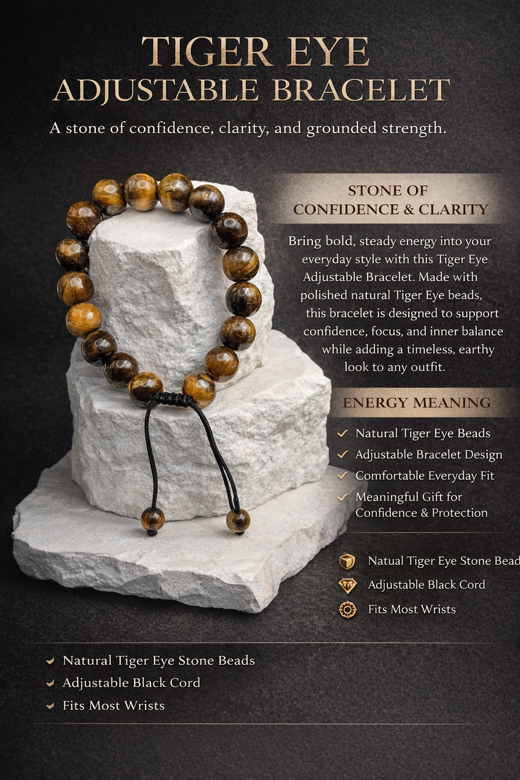 This adjustable Tiger Eye bracelet features natural 10mm stone beads and a comfortable fit for everyday wear. Known for its rich golden-brown tones, Tiger Eye is often associated with confidence, courage, focus, and protection. A classic piece that adds both style and meaning to your jewelry collection.